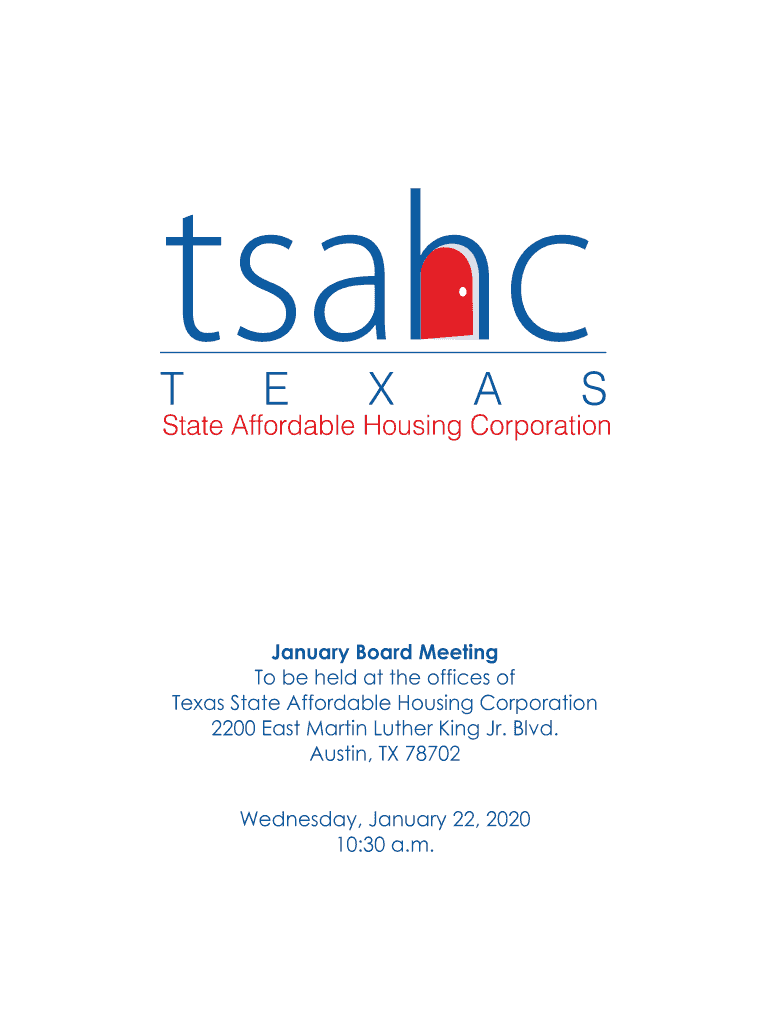 January Board Meeting To be held at the offices of Texas State Affordable Housing Corporation 2200 East Martin Luther King Jr. Blvd. Austin, TX 78702 Wednesday, January 22, 2020 10:30 a.m.TEXAS STATE