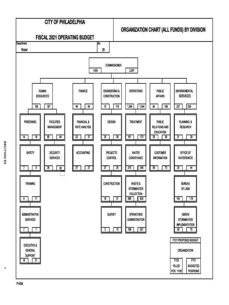 CITY OF PHILADELPHIAORGANIZATION CHART (ALL FUNDS) BY DIVISION FISCAL 2021 OPERATING BUDGET Department No. Water28COMMISSIONER 1,955HUMAN RESOURCES 156PERSONNEL141849FACILITIES MANAGEMENTFINANCIAL