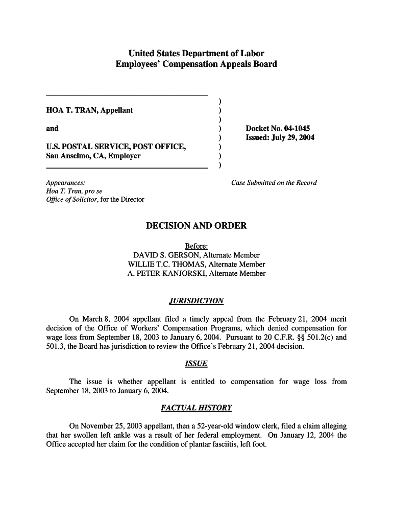 United States Department of Labor Employees Compensation Appeals Board HOA T. TRAN, Appellant and U.S. POSTAL SERVICE, POST OFFICE, San Anselmo, CA, Employer))))))))Appearances: HOA T. Tran, pro SE