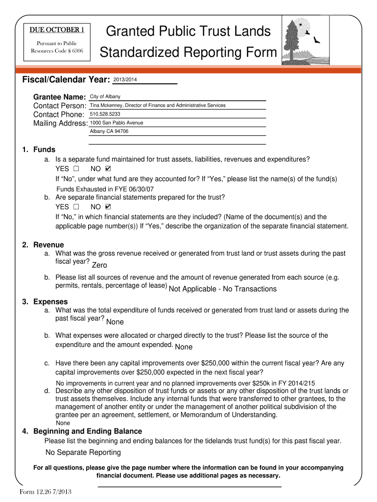 DUE OCTOBER 1 Pursuant to Public Resources Code 6306Granted Public Trust Lands Standardized Reporting Formica/Calendar Year:2013/2014Grantee Name: City of Albany Contact Person: Tina McKenna, Director