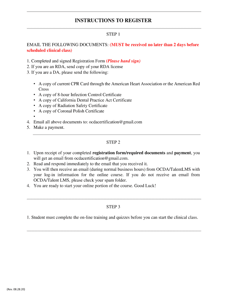 INSTRUCTIONS TO REGISTER STEP 1 EMAIL THE FOLLOWING DOCUMENTS: (MUST be received no later than 2 days before scheduled clinical class) 1. Completed and signed Registration Form (Please hand sign)
