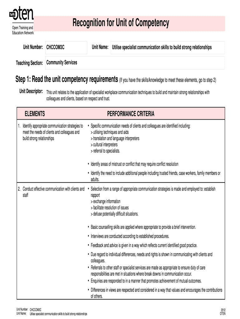 The Recognition for Unit of Competency is a form used by students in Australia to apply for recognition of prior learning in the Community Services sector.