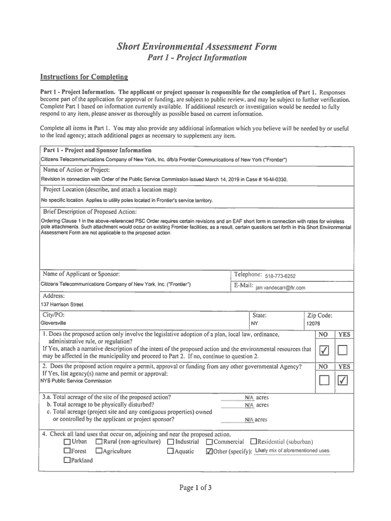 Short Environmental Assess111ent Form Part 1 Project /11formatio11 Instructions for Completing Part 1 Project Information. The applicant or project sponsor is responsible for the completion of Part