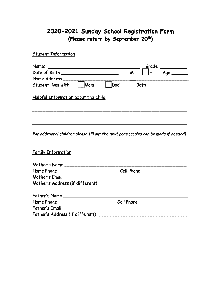20202021 Sunday School Registration Form (Please return by September 20th)Student Information Name: Grade: Date of Birth M F Age Home Address Student lives with: Mom Dad Both Helpful Information about