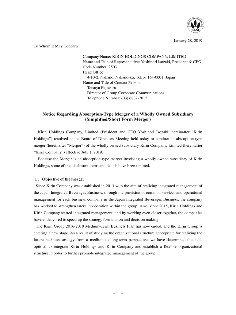 Get the free Notice Regarding Absorption-Type Merger of a Wholly Owned Subsidiary (Simplified/Sho...