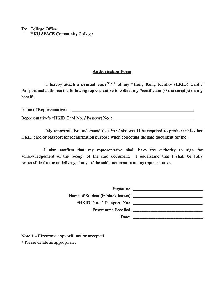 To: College Office HK SPACE Community CollegeAuthorisation Form I hereby attach a printed coyote 1 of my *Hong Kong Identity (HID) Card / Passport and authorize the following representative to collect