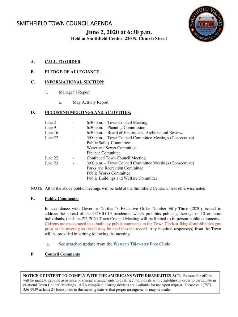 SMITHFIELD TOWN COUNCIL AGENDA June 2, 2020, at 6:30 p.m. Held at Smithfield Center, 220 N. Church Street. CALL TO ORDER.PLEDGE OF ALLEGIANCE.INFORMATIONAL SECTION: 1. Managers Report a.D. May Activity