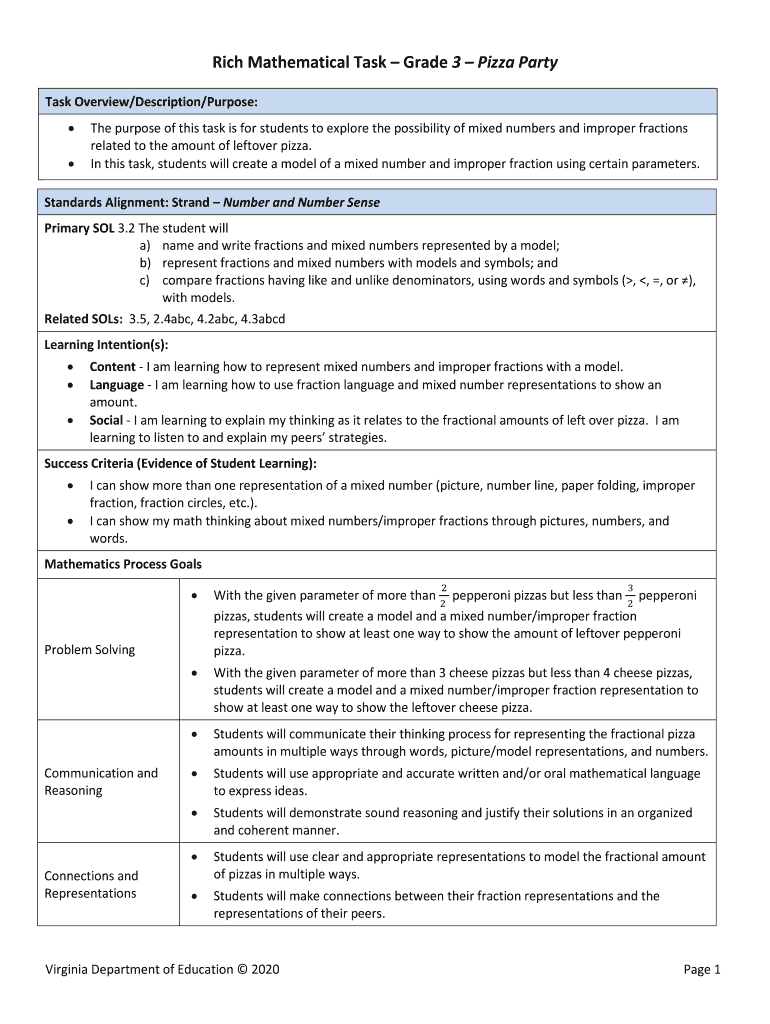 Rich Mathematical Task Grade 3 Pizza Party Task Overview/Description/Purpose: The purpose of this task is for students to explore the possibility of mixed numbers and improper fractions related to