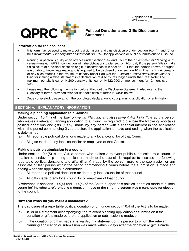 Application # (Office use only)Political Donations and Gifts Disclosure Statement Information for the applicant This form may be used to make a political donations and gifts disclosure under section