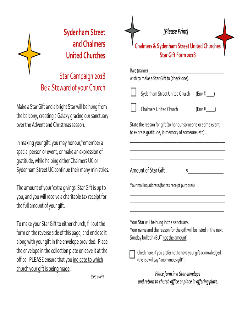 Dagenham Street and Chalmers United Churches Star Campaign 2018 Be a Steward of your Church Make a Star Gift and a bright Star will be hung from the balcony, creating a Galaxy gracing our sanctuary