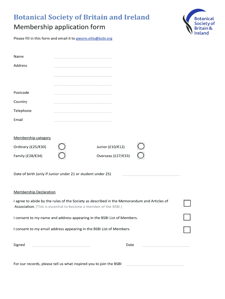 The Botanical Society Membership Application Form is a personal document used by individuals to apply for membership in the Botanical Society of Britain and Ireland.