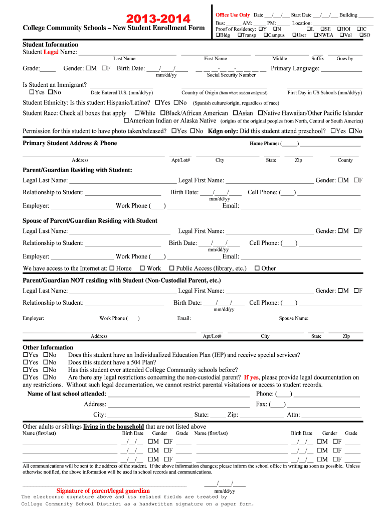 2013-2014 Office Use Only Date / / Start Date / / Building College Community Schools New Student Enrollment Form Bus: AM: PM: Location: Proof of Residency: ? Y ? N ? L ?SE ?HOI ?IC ? Bldg ? Trans
