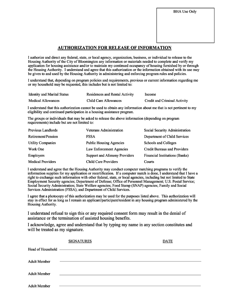 BHA Use OnlyAUTHORIZATION FOR RELEASE OF INFORMATION