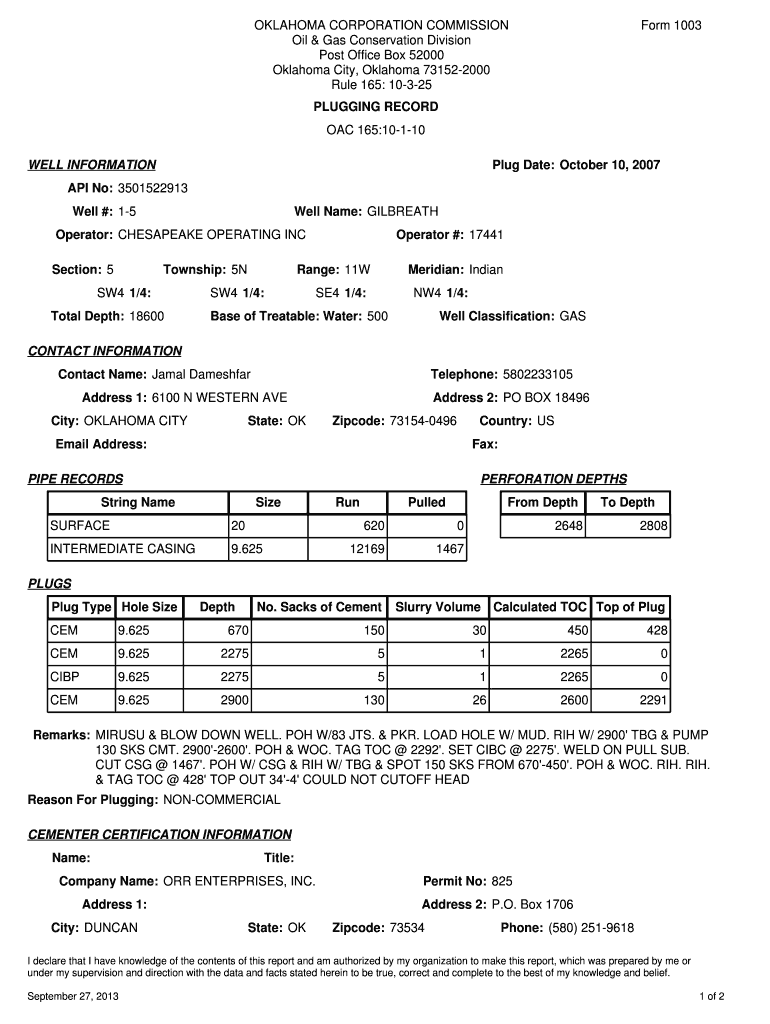 OKLAHOMA CORPORATION COMMISSION Oil & Gas Conservation Division Post Office Box 52000 Oklahoma City, Oklahoma 73152-2000 Rule 165: 10-3-25 Form 1003 PLUGGING RECORD MAC 165:10-1-10 WELL INFORMATION