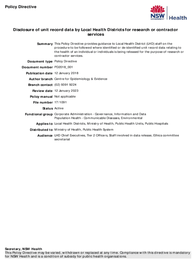 Policy DirectiveDisclosure of unit record data by Local Health Districts for research or contractor services Summary This Policy Directive provides guidance to Local Health District (LED) staff on
