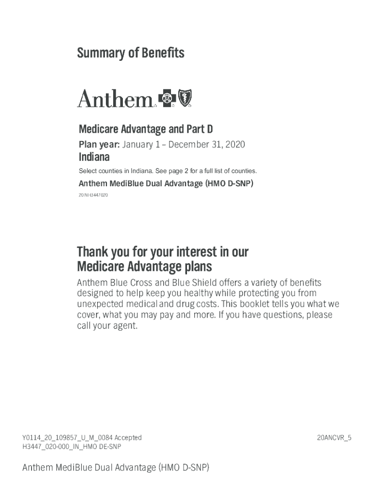 Summary of Benefits Medicare Advantage and Part D Plan year: January 1 December 31, 2020Indiana Select counties in Indiana. See page 2 for a full list of counties. Anthem Edible Dual Advantage (HMO