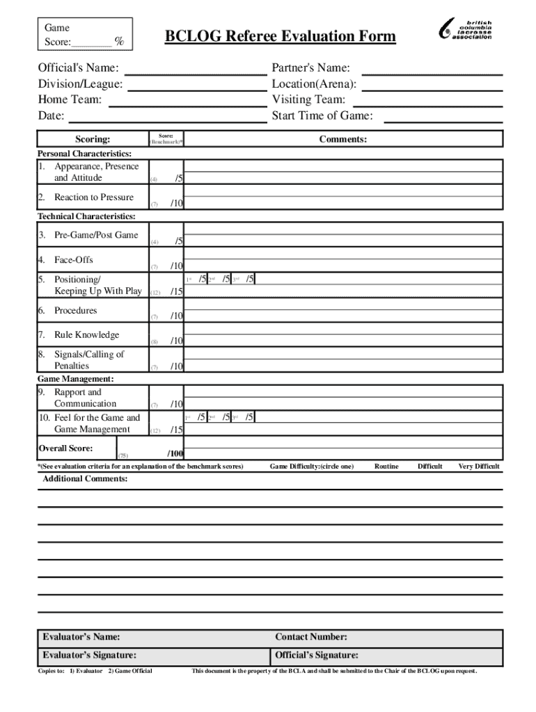 Get the free 2016 BCLOG Referee Evaluation Form with Criteria