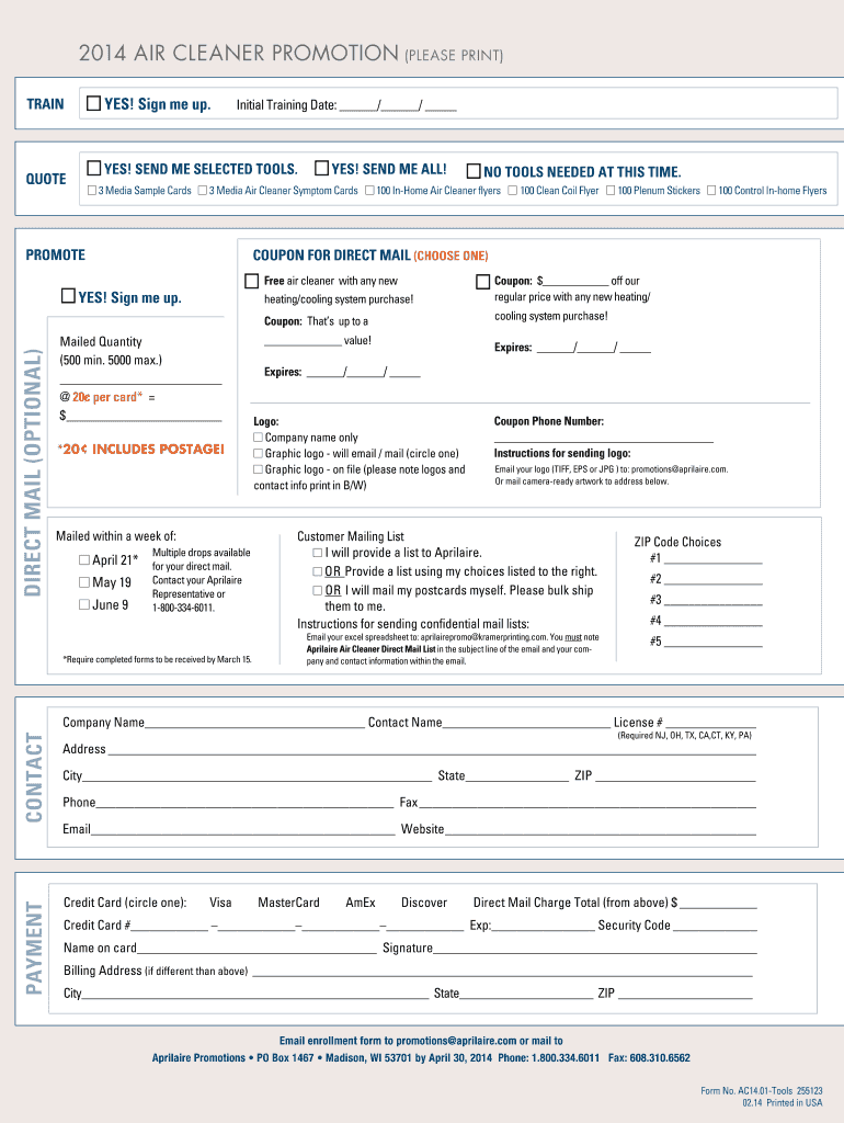 The Aprilaire Air Cleaner Promotion Form is designed to assist contractors in promoting the sale of whole-home air cleaners. This HVAC promotion form streamlines the process by providing essential information needed for promotion, such as training dates, coupon values, and mailing quantities. By utilizing this form, contractors can easily manage their promotional efforts while ensuring all necessary details are captured efficiently.