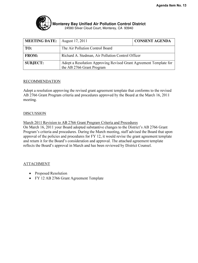 Agenda Item No. 13 Monterey Bay Unified Air Pollution Control District 24580 Silver Cloud Court, Monterey, CA 93940 MEETING DATE: August 17, 2011, TO: The Air Pollution Control Board FROM: Richard