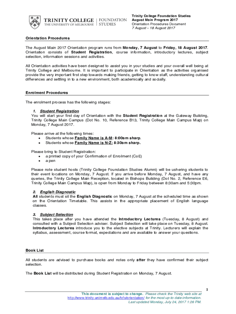 Trinity College Foundation Studies August Main Program 2017 Orientation Procedures Document 7 August 18 August 2017Orientation Procedures The August Main 2017 Orientation program runs from Monday,
