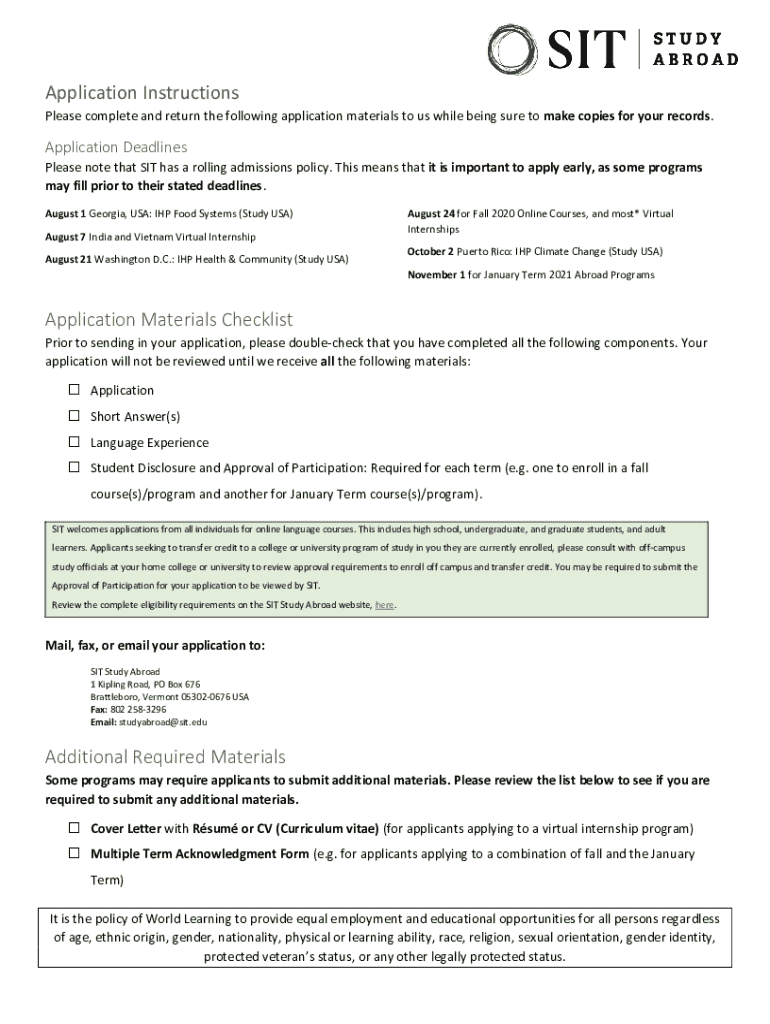 Application Instructions Please complete and return the following application materials to us while being sure to make copies for your records. Application Deadlines Please note that SIT has a rolling