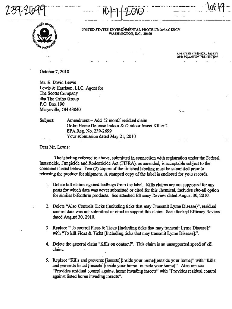 UNITED STATES ENVIRONMENTAL PROTECTION AGENCY WASHINGTON, D.C. 20460OFFICE OF CHEMICAL SAFETY AND POLLUTION PREVENTION October 7, 2010Mr. E. David Lewis & Harrison, LLC, Agent for The Scott's Company