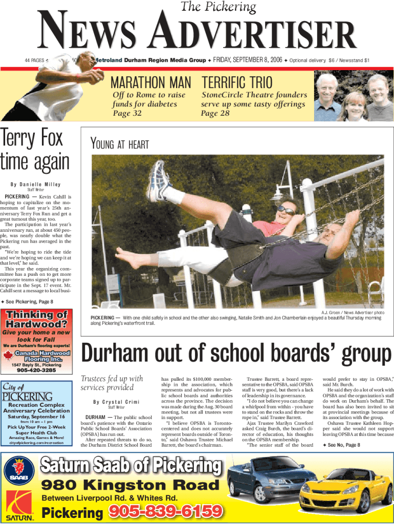 The Pickering44 PAGES Press run 50,900 Metro land Durham Region Media Group FRIDAY, SEPTEMBER 8, 2006, Optional delivery $6 / Newsstand $1MARATHON MAN TERRIFIC TRIO Off to Rome to raise funds for