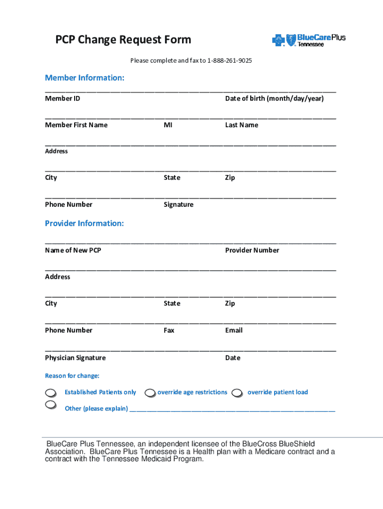 PCPChangeRequestForm Pleasecompleteandfaxto18882619025MemberInformation: MemberIDDateofbirth(month/day/year) MemberFirstNameMI Hostname Address CityStateZip PhoneNumberSignatureProviderInformation: