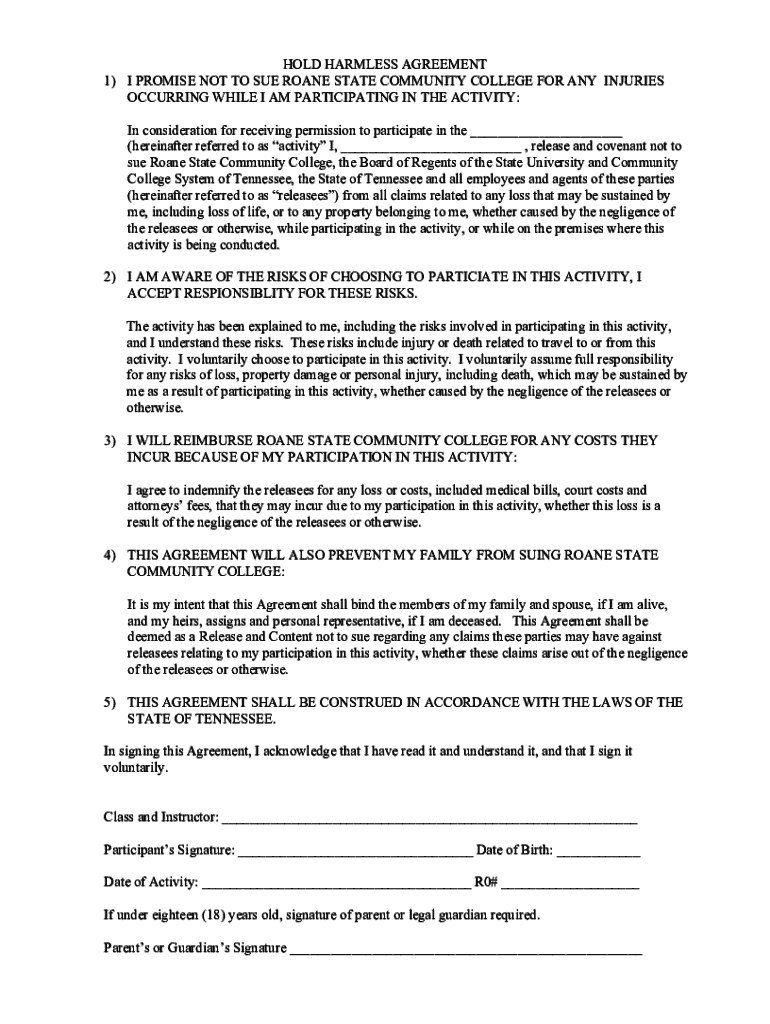 Get the free PDF Hold Harmless Agreement - Roane State Community College