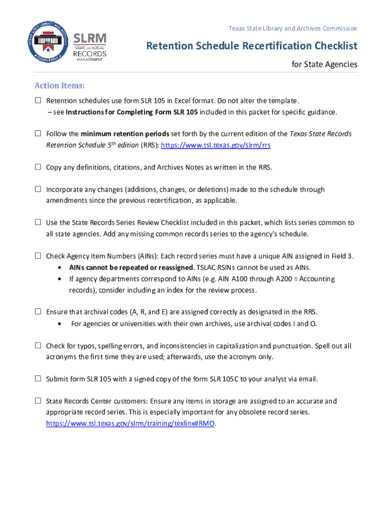 Texas State Library and Archives CommissionRetention Schedule Recertification Checklist for State Agencies Action Items: Retention schedules use form SLR 105 in Excel format. Do not alter the template.