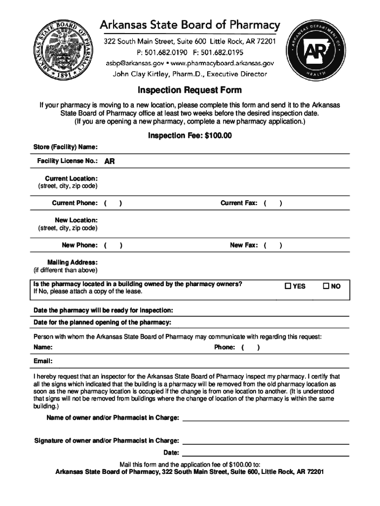 Get the free Inspection Request Form - Arkansas State Board of Pharmacy