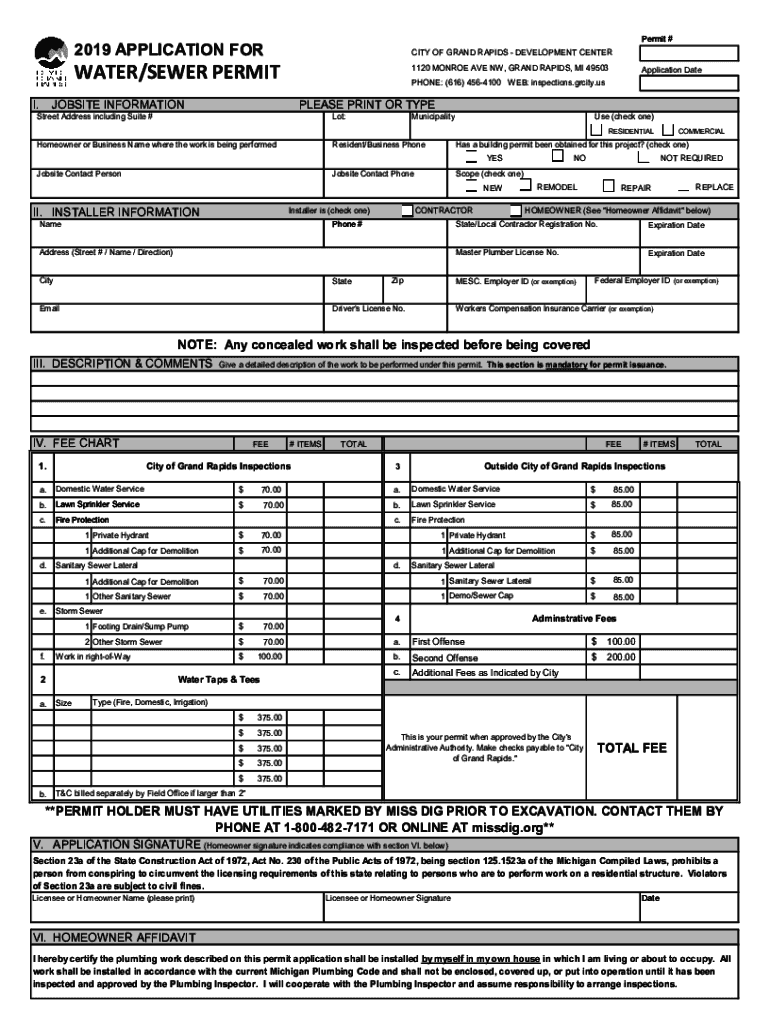 Permit #I.2019 APPLICATION FORCING OF GRAND RAPIDS DEVELOPMENT UNDERWATER/SEWER PERMIT1120 MONROE AVE NW, GRAND RAPIDS, MI 49503Application Telephone: (616) 4564100 WEB: inspections.gr city.usJOBSITE