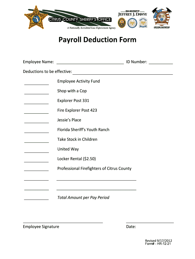 Payroll Deduction Form Employee Name: ID Number: Deductions to be effective: Employee Activity Fund Shop with a Cop Explorer Post 331 Fire Explorer Post 423 Jessie s Place Florida Sheriff s Youth
