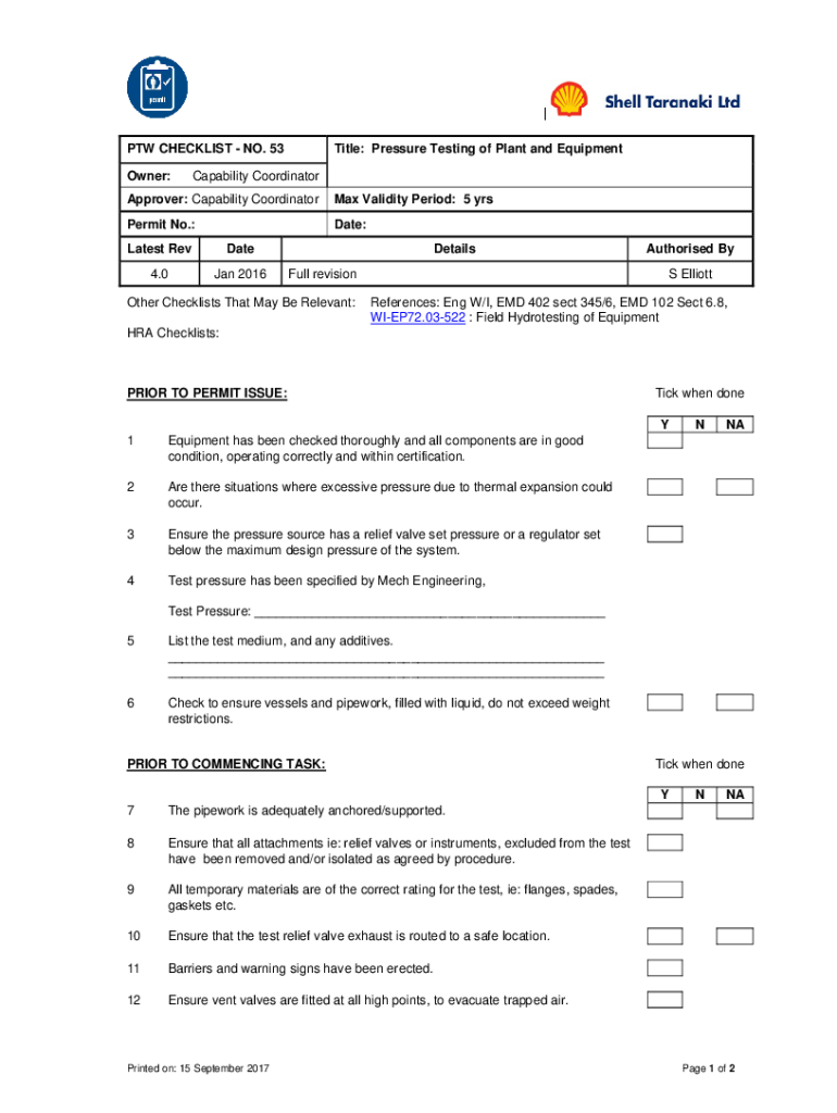 BTW CHECKLIST NO. 53 Owner:Title: Pressure Testing of Plant and EquipmentCapability CoordinatorApprover: Capability Coordinator Max Validity Period: 5 permit No.:Date:Latest RevDate4.0Jan 2016Details