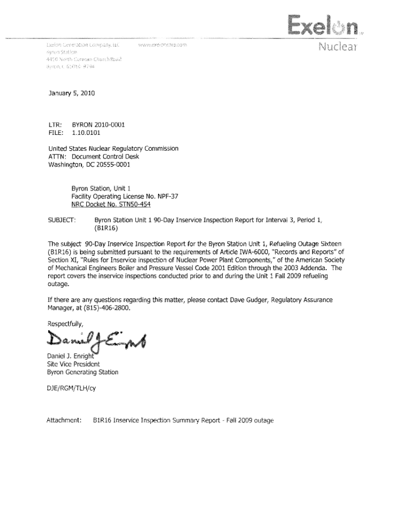 Get the free Byron Station, Unit 1, 90-Day Inservice Inspection Report for Interval 3, Period 1, ...