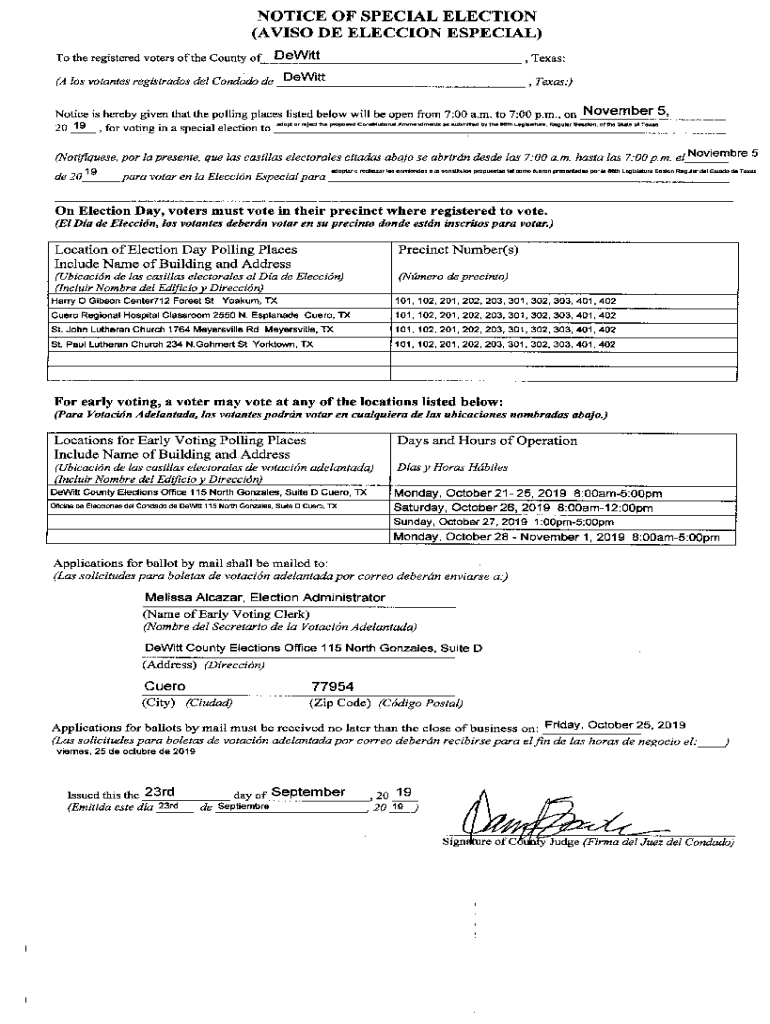 To the registered voters of the County Dewitt, Texas:(A Los rotates registrants Del Condado de DeWitt, Texas:)Notice is hereby given that the