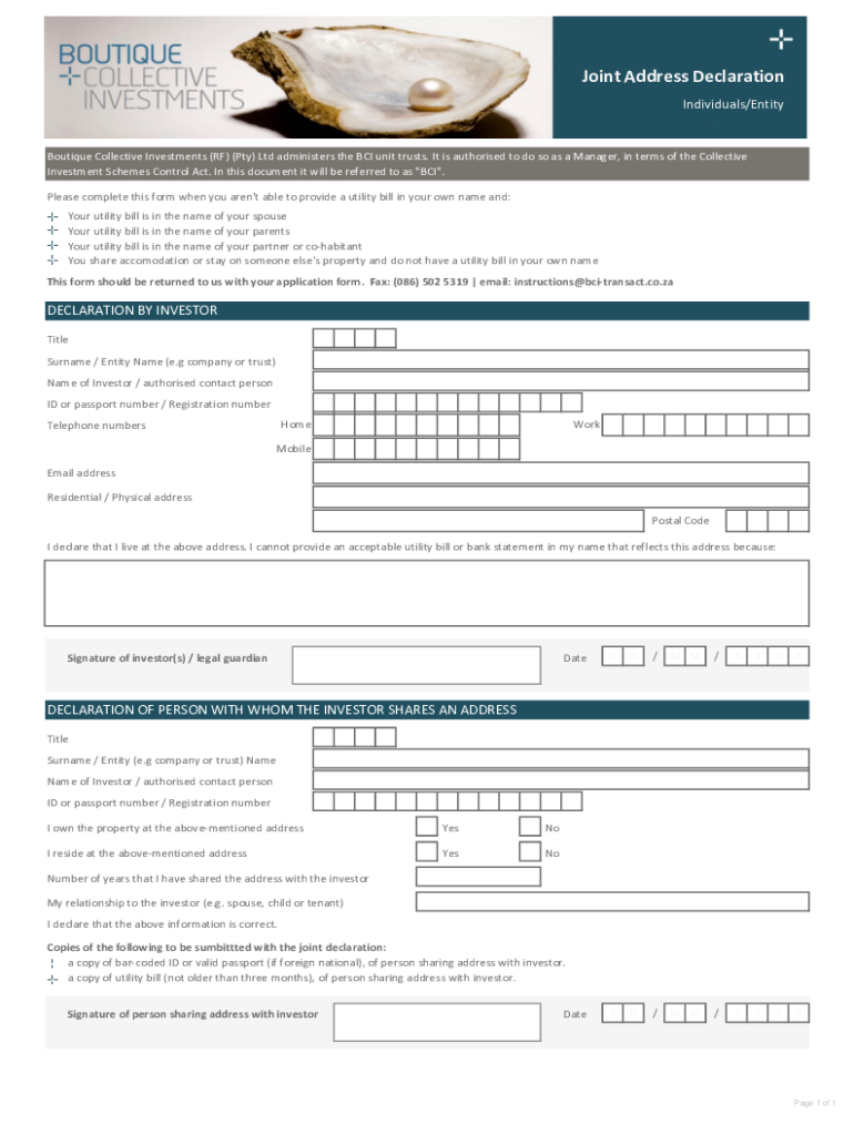 Joint Address Declaration Individuals/EntityBoutique Collective Investments (RF) (Pty) Ltd administers the BCI unit trusts. It is authorized to do so as a Manager, in terms of the Collective Investment