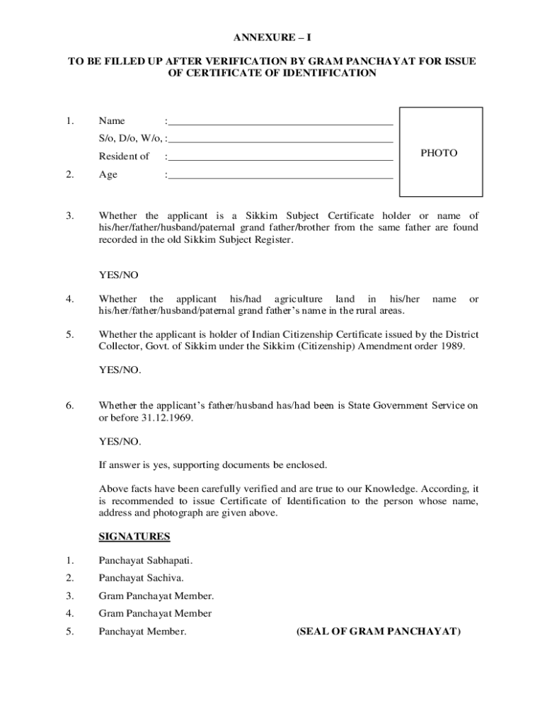 This document serves as a verification form for the issue of a Certificate of Identification by the Gram Panchayat in Sikkim. It collects personal information, citizenship status, and agricultural