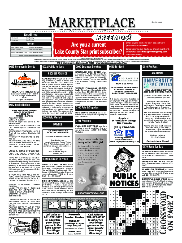 Marketplace Oct. 8, 2020Lake County Star: (231) 5928348 classified pioneer group.deadlines: Weekly combo free ADS! Noon Tuesday Noon ThursdayRates: Up to 15 Words, 1 Day$9.25 (add words 25/ea.) Combo,