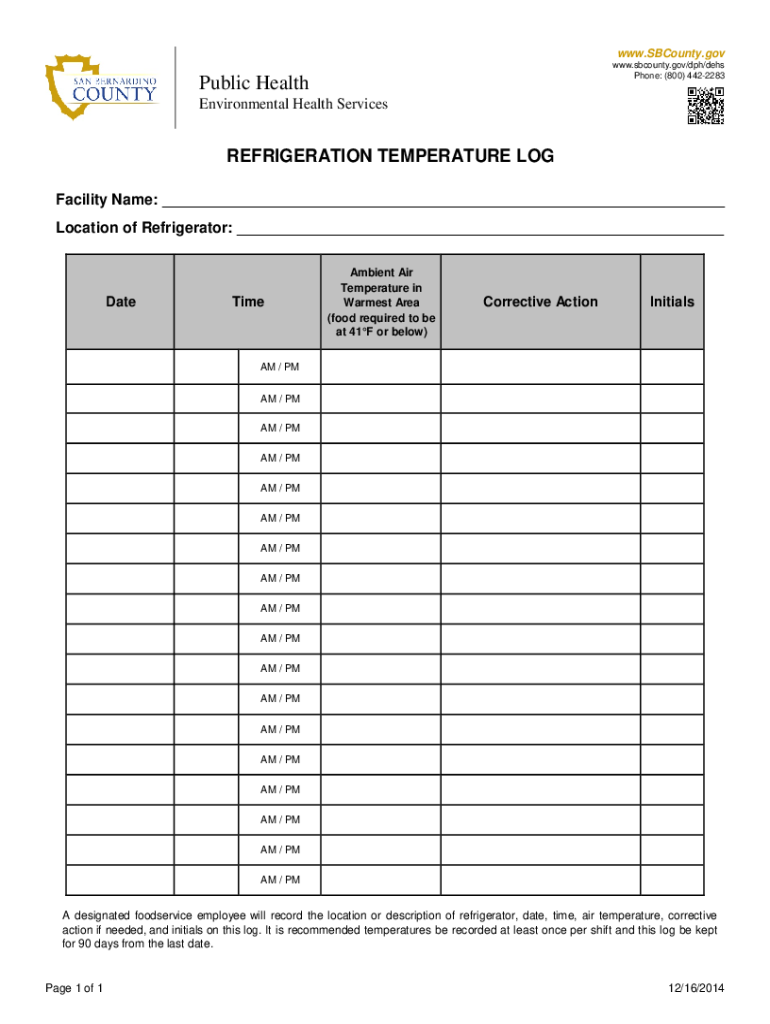 WWW.County.gov www.sbcounty.gov/dph/dehs Phone: (800) 4422283Public Health Environmental Health ServicesREFRIGERATION TEMPERATURE LOG Facility Name: Location of Refrigerator: DateTimeAmbient Air Temperature
