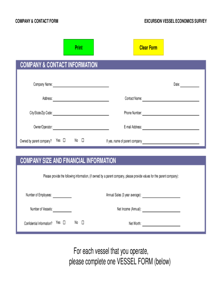 COMPANY & CONTACT FORMEXCURSION VESSEL ECONOMICS SURVEYPrintClear FormCOMPANY & CONTACT INFORMATION Company Name:Date:Address:Contact Name:City/State/Zip Code:Phone Number:Owner/Operator:Email Address:Owned