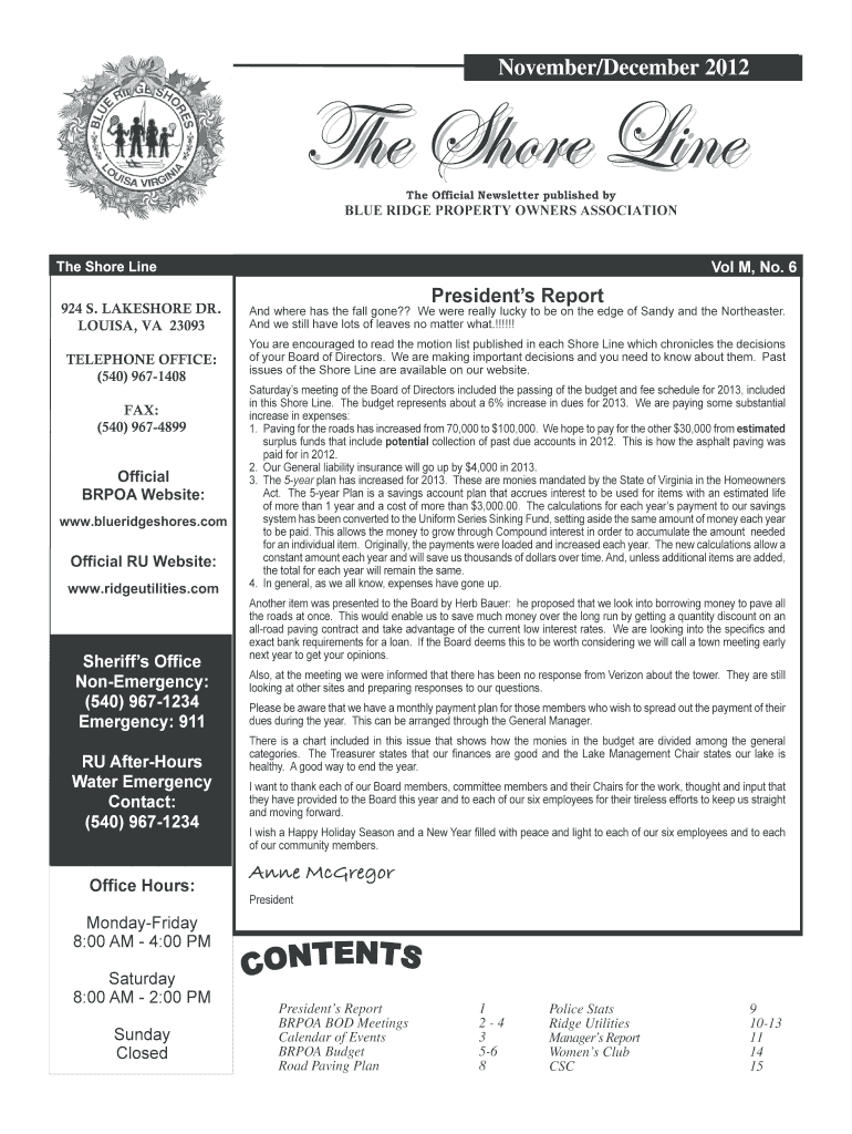 November/December 2010 November/December 2012 2012 September October go FX x The Official Newsletter published by BLUE RIDGE PROPERTY OWNERS ASSOCIATION The Shore Line 924 S. ASHORE DR. LOUISA, VA