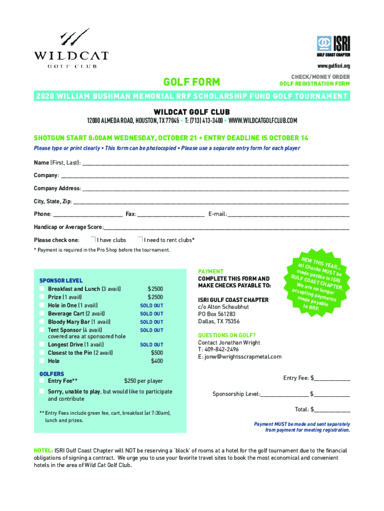 WWW.gunfire.org CHECK/MONEY ORDER GOLF REGISTRATION FOOTGOLF FORM2020 WILLIAM BUSHMAN MEMORIAL RRF SCHOLARSHIP FUND GOLF TOURNAMENT WILDCAT GOLF CLUB 12000 ALM EDA ROAD, HOUSTON, TX 77045 T: (713)