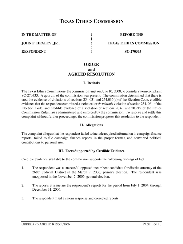 TEXAS ETHICS COMMISSION IN THE MATTER OF JOHN F. HEALEY, JR., RESPONDENTBEFORE THE TEXAS ETHICS COMMISSION SC270333ORDER and AGREED RESOLUTION I. Recitals The Texas Ethics Commission (the commission)