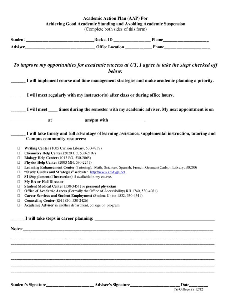 Academic Action Plan (AAP) For Achieving Good Academic Standing and Avoiding Academic Suspension (Complete both sides of this form) Student Rocket ID Phone Adviser Office Location Phone To improve