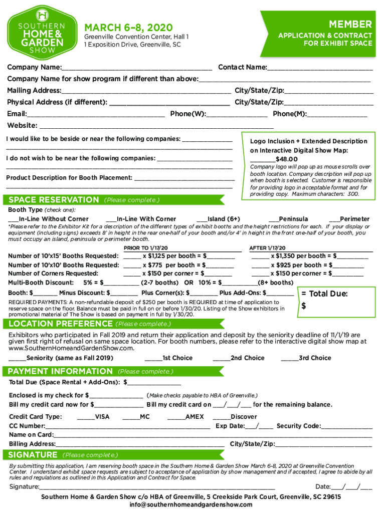 MEMBERMARCH 68, 2020APPLICATION & CONTRACT FOR EXHIBIT SPACE Greenville Convention Center, Hall 1 1 Exposition Drive, Greenville, Accompany Name: Contact Name: Company Name for show program if different