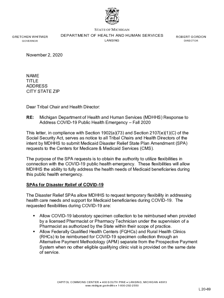 STATE OF MICHIGAN DEPARTMENT OF HEALTH AND HUMAN SERVICESGRETCHEN WHITMERLANSINGGOVERNORROBERT GORDON DIRECTOR November 2, 2020NAME TITLE ADDRESS CITY STATE ZIP Dear Tribal Chair and Health Director: