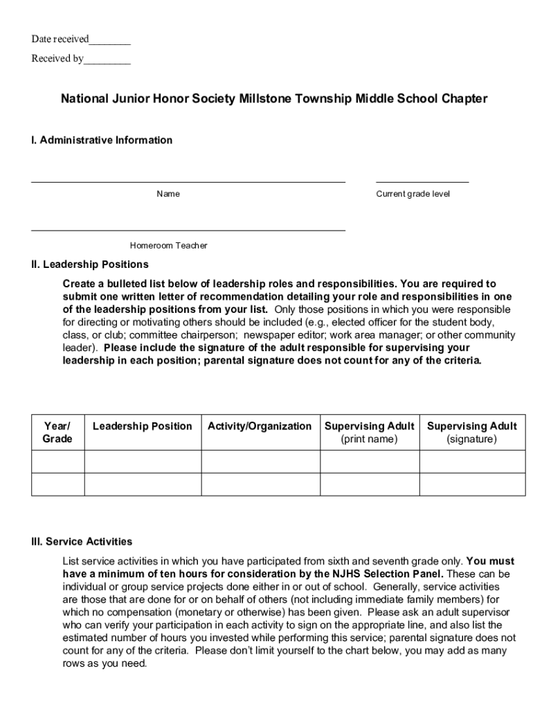 Date received by National Junior Honor Society Millstone Township Middle School Chapter I. Administrative Information Name Current grade level Homeroom Teacher II. Leadership PositionsCreate a bulleted
