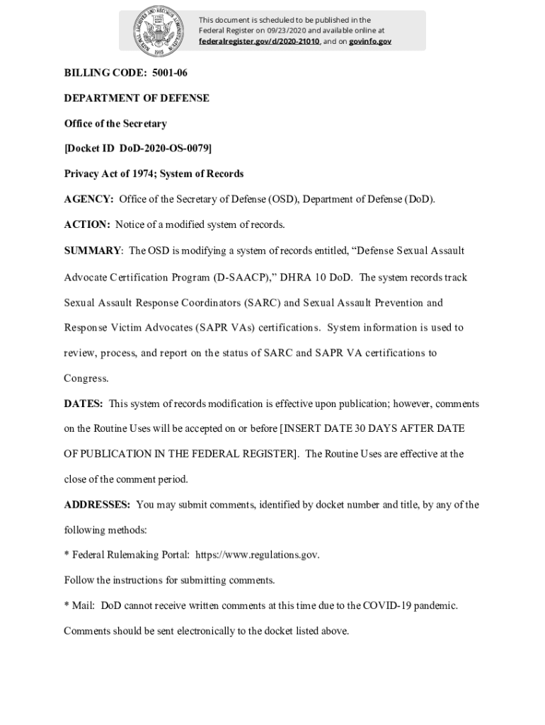 This document is scheduled to be published in the Federal Register on 09/23/2020 and available online at federalregister.gov/d/202021010, and on gov info. Billing CODE: 500106 DEPARTMENT OF DEFENSE