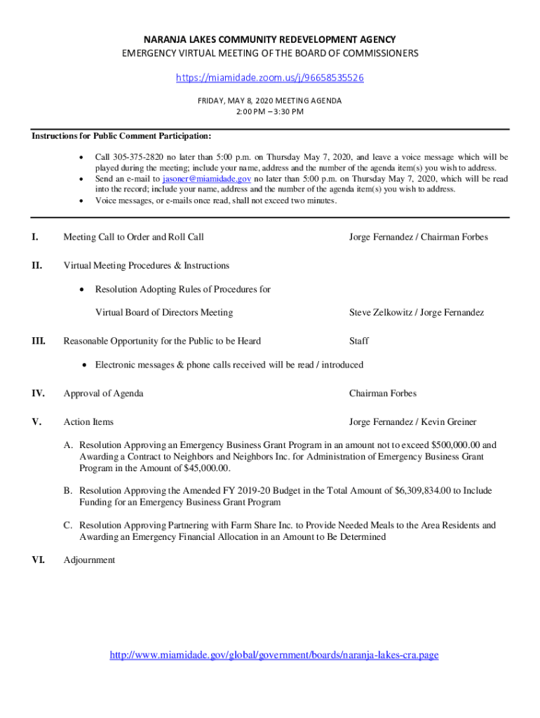 Paraná LAKES COMMUNITY REDEVELOPMENT AGENCY EMERGENCY VIRTUAL MEETING OF THE BOARD OF COMMISSIONERS https://miamidade.zoom.us/j/96658535526 FRIDAY, MAY 8, 2020, MEETING AGENDA 2:00 PM 3:30 PM Instructions